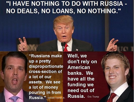 POLITICO: The definitive guide to Trump's Russia ties By MADELINE CONWAY - 03/02/17 READ FULL STORY A Who's Who of the Trump Campaign's Russia Connections Everything we know about the members of Trump's campaign who had contact with the Russian government Full Story Trump associates' links with Russia: what we know so far Questions continue to be asked about the scale of alleged Russian influence over the president and the campaign that took him to the White House. Here we look at the links – known and alleged – between Donald Trump's associates and allies and Moscow Thursday 2 March 2017 FULL STORY Here are the biggest links 'and alleged links' between the Trump campaign and Russia by:Fred Imbert FULL STORY Donald Trump's ties to Russia go back 30 years Oren Dorell , USA TODAY FULL STORY THE RACHEL MADDOW SHOW 2/27/17 New Commerce Secretary at nexus of lucrative Trump Russian deal With a line that runs through newly confirmed Commerce Secretary Wilbur Ross, Rachel Maddow connects the dots between a billionaire Russian oligarch and a Donald Trump deal worth tens of millions of dollars. Duration: 21:44 "Russian fertilizer king is co-owner of the bank of Cyprus, which is known for laundering money for Russian oligarchs. Fertilizer king/banker has bad divorce. Seeks to hide assets by buying property in the US. In 2004, DJT buys a property at auction in Palm Beach for $40m. Along comes Russian oligarch. Needing to hide assets. And in 2006? He pays $100m for the same property. 2.5 times the price DJT paid two years earlier. The single most expensive house transaction ever in the US. At exactly the time that DJT needed money to help him out with his bankruptcy. Poof! $60m out of nowhere. DJT and oligarch claim they never met. Except through one person, the only American who co-owns the money laundering bank of Cyprus. That person? Who organized the deal? Wilbur Ross. Our new secretary of commerce. And then the last bit: in 2013, Russia started to acquire kompromat on Trump (see: the dossier). Why? Because he was helping Russian oligarchs hide their money, and they wanted to keep him on the straight and narrow. Now? NOW IT ALL STARTS TO MAKE SENSE." -- Rachel Maddow. White House accused of blocking information on bank's Trump-Russia links New commerce secretary Wilbur Ross's response about possible links between Bank of Cyprus, Russian agents and Trump officials wasn't released to Senate FULL STORY 229 House Republicans just voted to keep Trump's tax returns secret 'The American people have the right to know.' FULL STORY The Secret to Trump .. He's Really A Russian Oligarch VIEW EVIDENCE